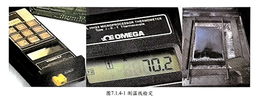 热电偶制作后,需使用测温仪对每根测温线作检测,以确定其功能正常,温度测量准确。一般采用校准后的 小锡炉将焊锡熔化,小锡炉设定温度在250℃,热电偶熔接端插入小锡炉,另一端接插于温度测试仪,读取实际 测试温度以判定测温线合格与否。此方案也常用于工厂购置测温线进料检验。图7.1.4-1测温线检定。
