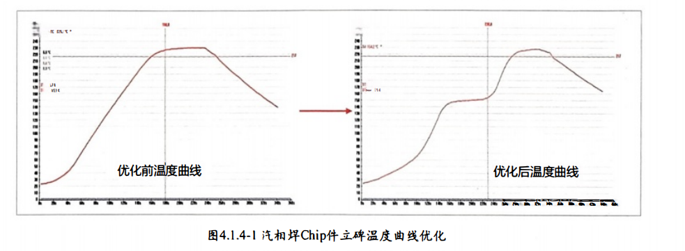某产品使用汽相焊接,0402 06030805表贴电容、电感、电阻出现立碑、虚焊现象。 分析发现目视可见Chip件两端电极焊锡熔化时间存在明显差异,润湿力不平衡导致立碑虚焊。因汽相焊机理为蒸汽做热交换,焊接时蒸汽密度不同则热交换能力不同,也就是加热速度不同。 PCB本体阻挡蒸汽,导致板子四周蒸汽密度大,加热速度快,PCB中间蒸汽密度低,加热速度慢,焊锡熔化存在明显时间差。调整汽相焊板子高度及驻留时间,从 RTS温度曲线改为RSS温度曲线,图 4.1.4-1 汽相焊Chip件立碑温度曲线优化,Chip件立碑、虚焊现象基本消失。