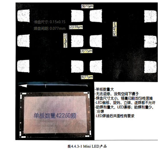 Mini LED与 Micro LED焊接时有几个困扰 ,一是焊锡量如何保证均匀 ,二 是焊接后LED不得出现大幅度偏移,三是LED高低有限制,四是焊接时间过长会导致焊点冷焊、虚焊、立碑,如果增加助焊剂的量会导致LED漂移、偏位。图4.4.3-1 Mini LED主板显示,单板LED数量42260颗,焊盘尺寸(0.15mm×0.15mm,焊盘间距0.077mm。